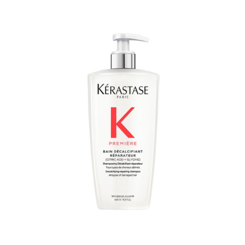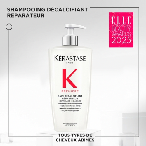 Das Kérastase Première Bain Décalcifiant Réparateur in der großzügigen 500-ml-Pumpflasche ist ein entkalkendes, reparierendes Shampoo, das geschädigtes Haar von innen heraus regeneriert. Es entfernt Kalziumablagerungen, die durch hartes Wasser entstehen und die Haarstruktur schwächen, und sorgt so für geschmeidiges, glänzendes und kräftigeres Haar.