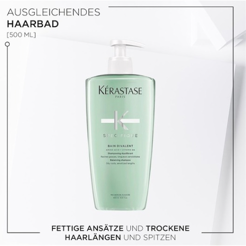 Das Kérastase Spécifique Bain Divalent in der praktischen 500-ml-Pumpflasche ist ein ausgleichendes Shampoo, das speziell entwickelt wurde, um die Talgproduktion an der Kopfhaut zu regulieren und gleichzeitig trockene Längen und Spitzen zu pflegen. Es sorgt für eine frische, saubere Kopfhaut und geschmeidiges, gepflegtes Haar.