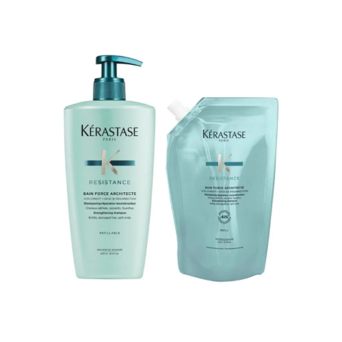 Das Kérastase Résistance Bain Force Architecte Refill Pouch bietet eine nachhaltige Pflegelösung für geschädigtes und geschwächtes Haar. Es enthält eine elegante, wiederverwendbare Pumpflasche (500 ml) und den passenden Eco-Refill-Nachfüllbeutel (500 ml). Das Shampoo stärkt die Haarfaser von innen heraus, repariert brüchige Längen und reduziert Haarbruch – ideal für Haar mit Erosionslevel 1–2.