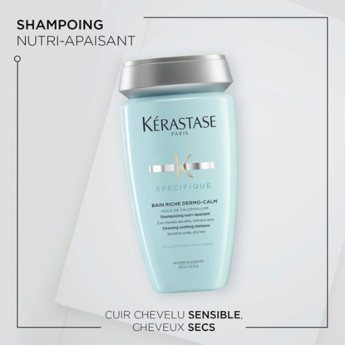 Das Kérastase Bain Riche Dermo-Calm ist ein reichhaltiges, beruhigendes Shampoo, das speziell für empfindliche Kopfhaut und trockenes Haar entwickelt wurde. Es reinigt sanft, spendet intensive Feuchtigkeit und lindert Reizungen, Juckreiz und Spannungsgefühle – für sofortigen Komfort und geschmeidiges Haar.