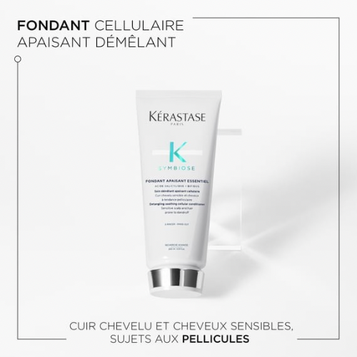 Der Kérastase Symbiose Fondant Apaisant Essentiel ist ein sanft pflegender Conditioner, der speziell für empfindliche, zu Schuppen neigende Kopfhaut entwickelt wurde. Er entwirrt das Haar mühelos, spendet Feuchtigkeit und beruhigt die Kopfhaut, ohne zu beschweren.