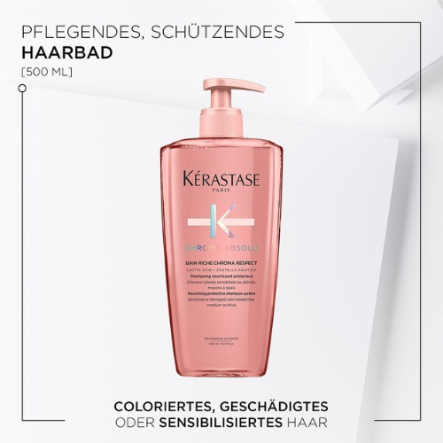 Das Kérastase Bain Riche Chroma Respect in der praktischen 500 ml-Pumpflasche bietet intensive Pflege für trockenes, empfindliches oder stark coloriertes Haar. Die reichhaltige, sulfatfreie Formel mit Milchsäure und Centella Asiatica reinigt sanft, stärkt die Haarfaser und schützt die Farbbrillanz. Für geschmeidiges, glänzendes und gesund aussehendes Haar.