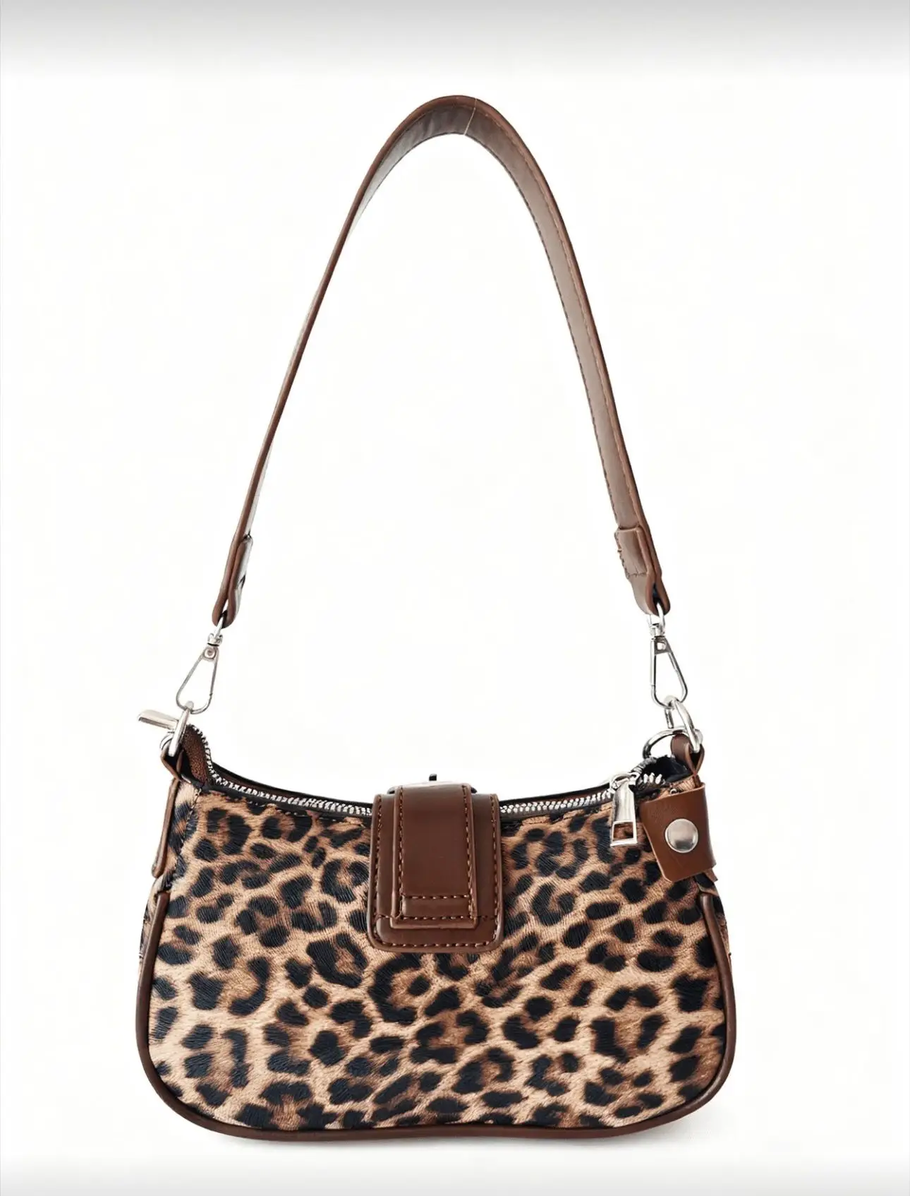 Diese auffällige Schultertasche kombiniert trendiges Leopardenmuster mit edgy Details und wird so zum absoluten Statement Piece. Die Mischung aus braunem Kunstleder und Animal Print verleiht der Tasche einen modernen Y2K- und Streetstyle Look.
