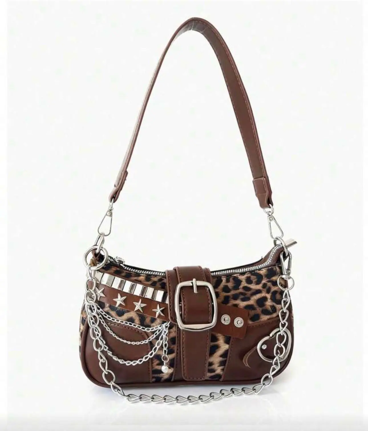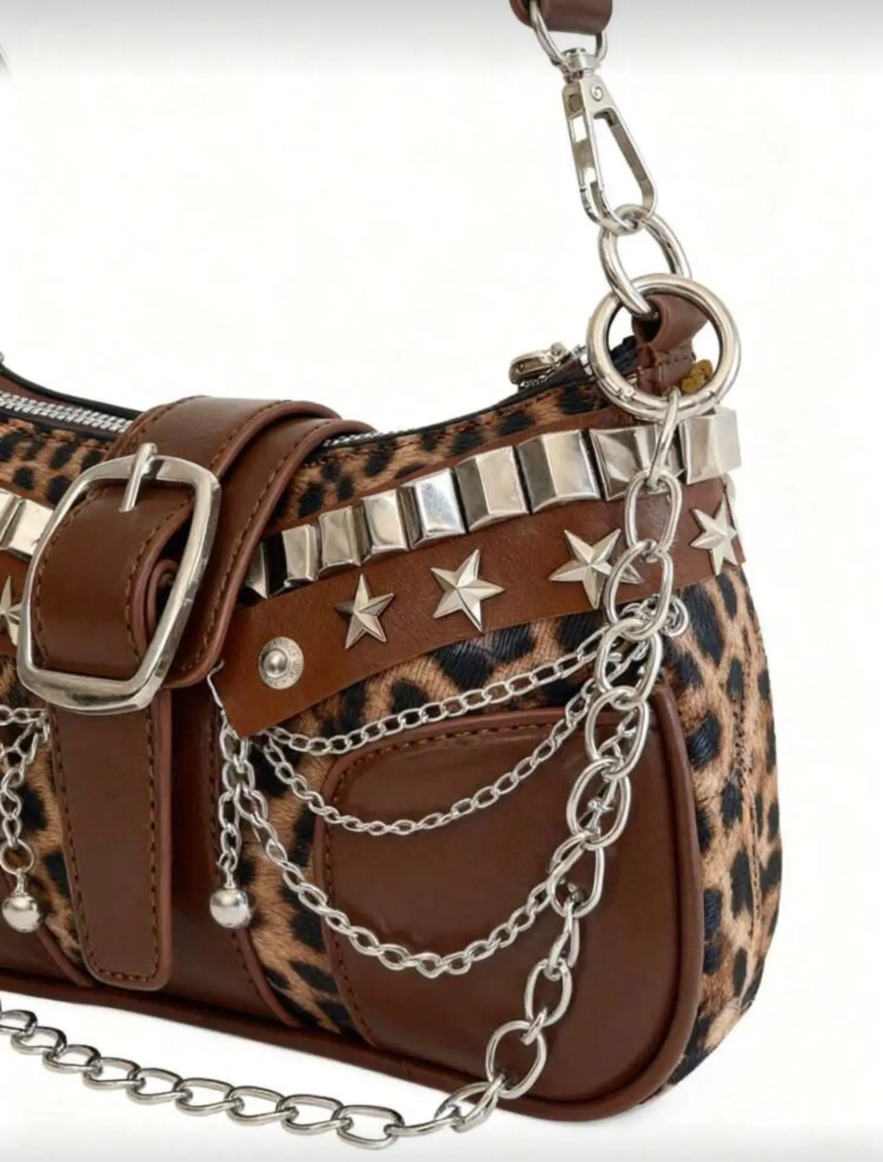Be the first to review “Leopard Schultertasche mit Schnalle, Ketten & Nieten Details”