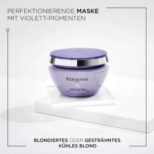 Die Kérastase Blond Absolu Masque Ultra-Violet ist eine intensiv pflegende und neutralisierende Haarmaske, die speziell entwickelt wurde, um Gelb- und Kupfertöne in blondiertem, aufgehelltem oder grauem Haar zu neutralisieren.