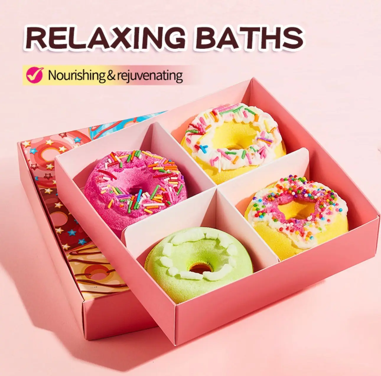 Dieses liebevoll gestaltete Donut Badebomben 4er Set verwandelt jedes Bad in ein entspannendes Wellness-Erlebnis. Jede Badebombe sprudelt sanft im Wasser, verleiht dem Bad eine angenehme Farbe und verströmt einen wohltuenden Duft.