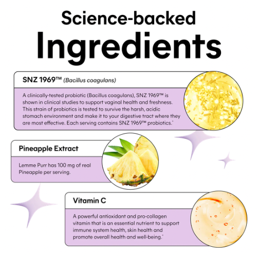 Formuliert mit 4 klinisch untersuchten vaginalen Probiotika zur Unterstützung des pH-Gleichgewichts, der vaginalen Gesundheit und der Gesundheit der Harnwege (UT). Vitamin C unterstützt die Immunfunktion, während Ananasextrakt das Ganze versüßt.