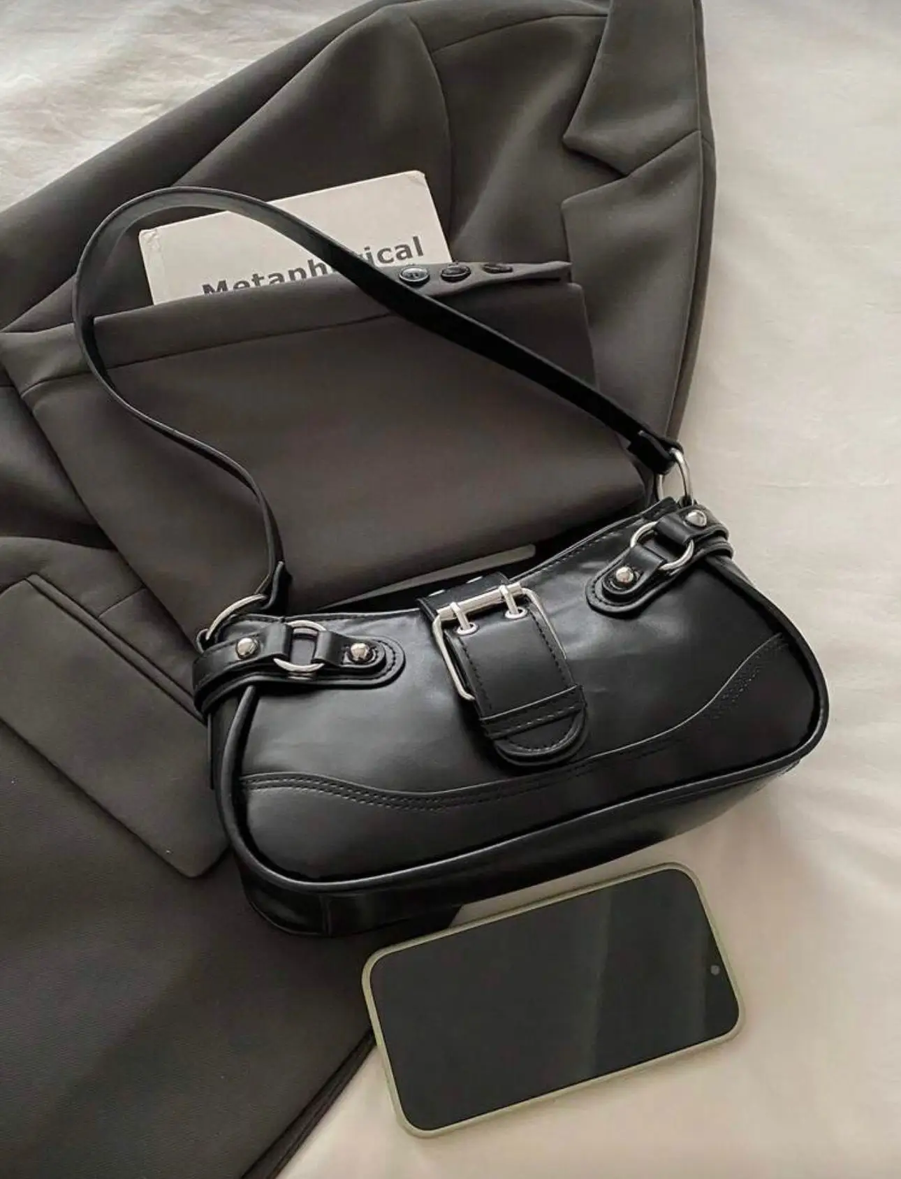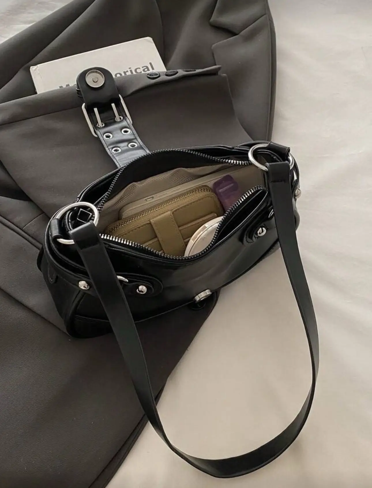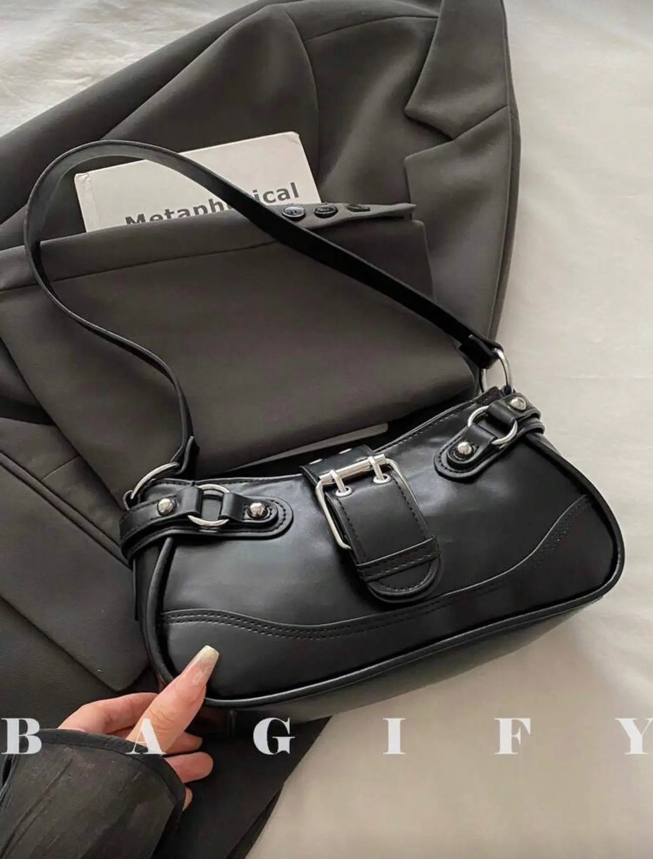 Be the first to review “Schwarze Schultertasche mit Schnalle im minimalistischen Design”