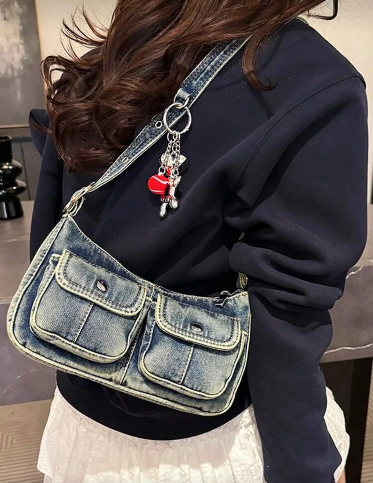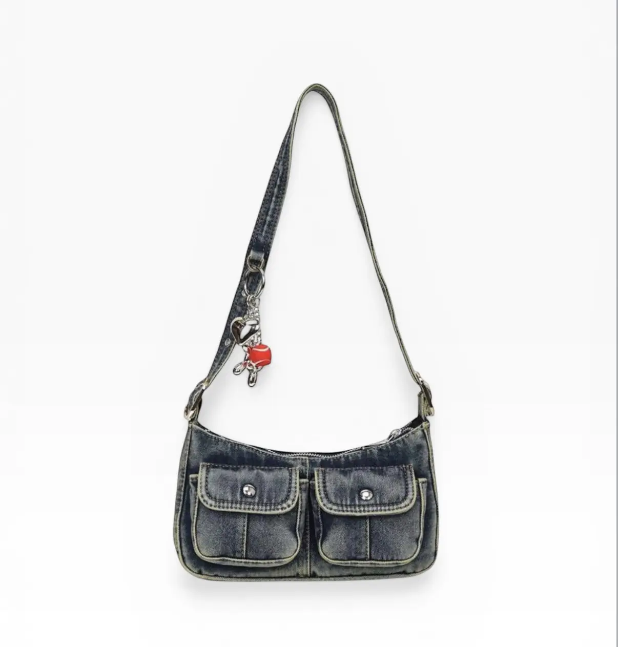 Vintage Denim Schultertasche mit Utility-Taschen & Charms