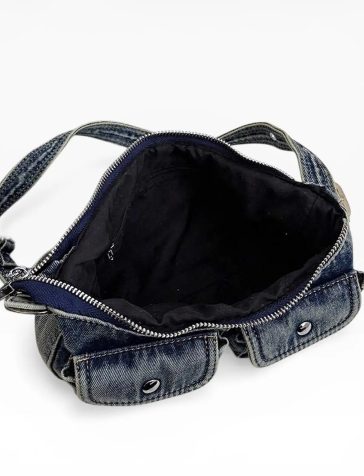 Diese trendige Schultertasche aus Denim vereint lässigen Y2K-Vibe mit praktischer Funktionalität. Der gewaschene Jeansstoff sorgt für einen coolen, leicht vintage-inspirierten Look, während die zwei aufgesetzten Fronttaschen mit Druckknöpfen zusätzlichen Stauraum für kleine Essentials bieten.